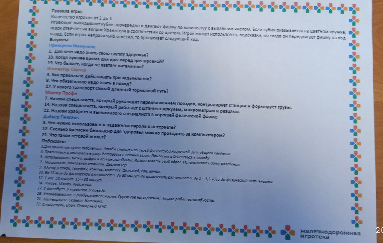 Участники программы "Железное здоровье" создали для малышей настольную игру - ходилку. За основу взяли тест для младших отрядов по программе "Железнодорожная игротека". Будет весело играть, а главное - познавательно!